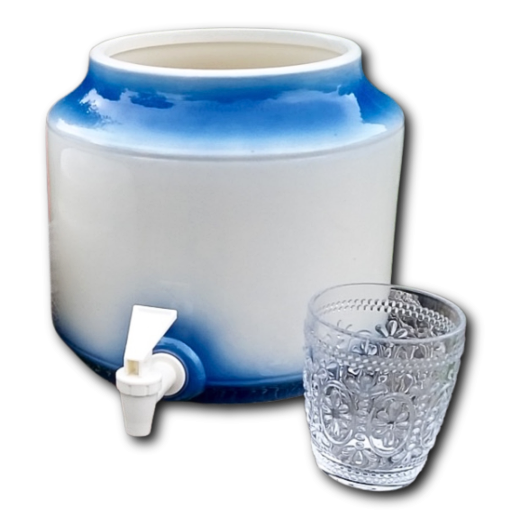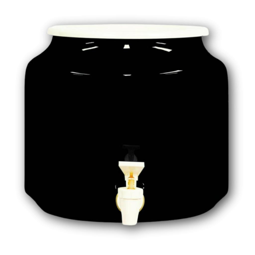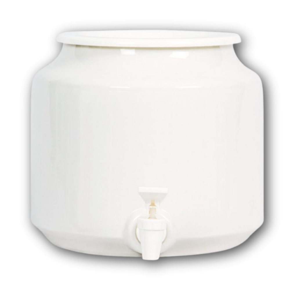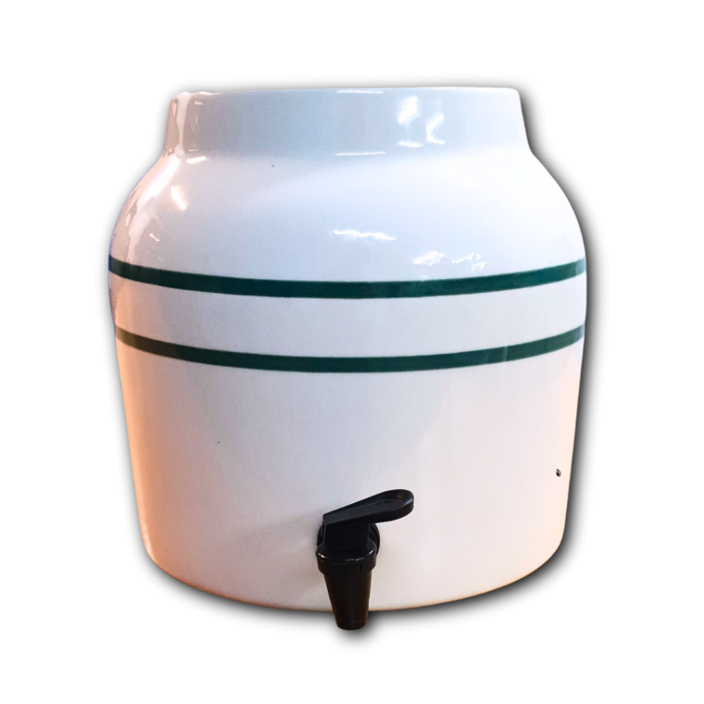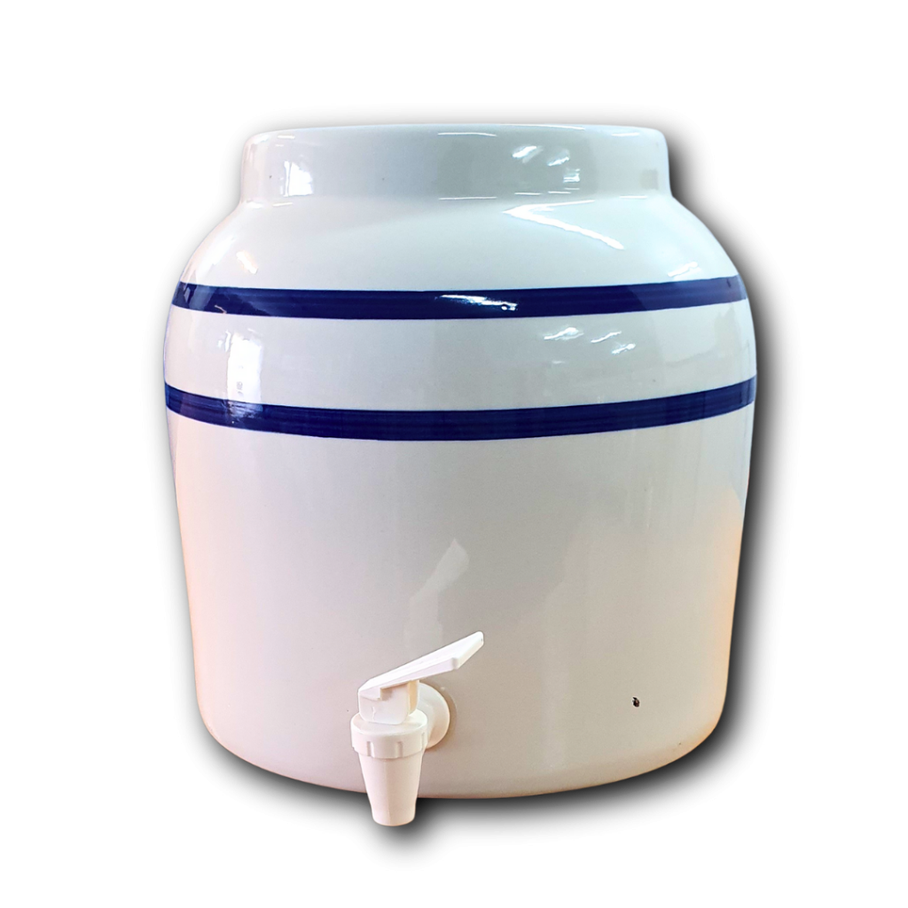 A ceramic water dispenser allows the storage and dispensing of your spring water. It keeps the water in the dark, and a degree celsius below room temperature – both ideal qualities for the drinking and storing of water.